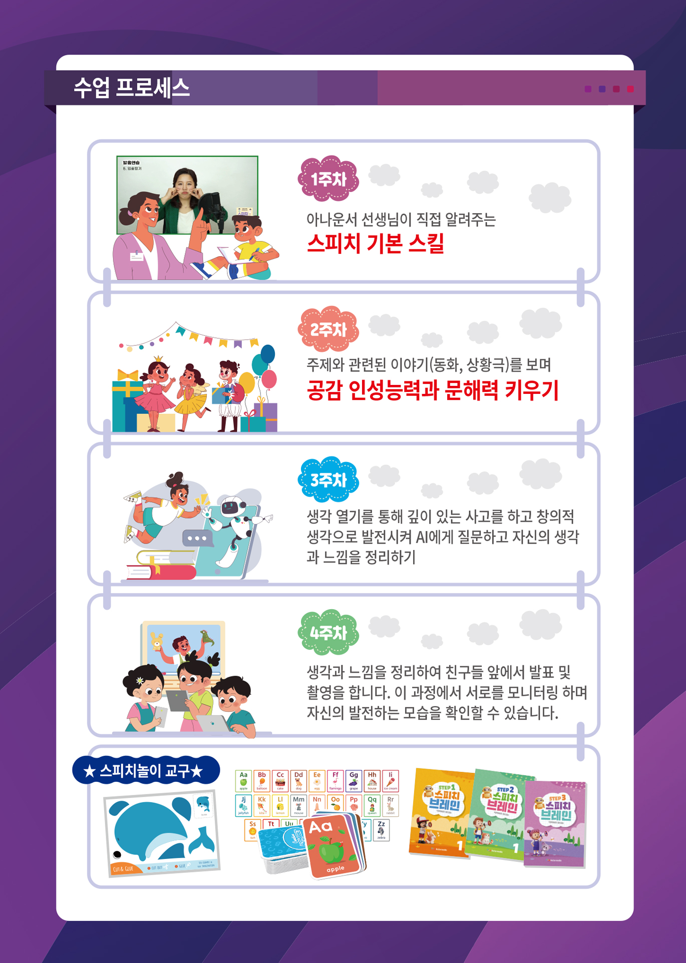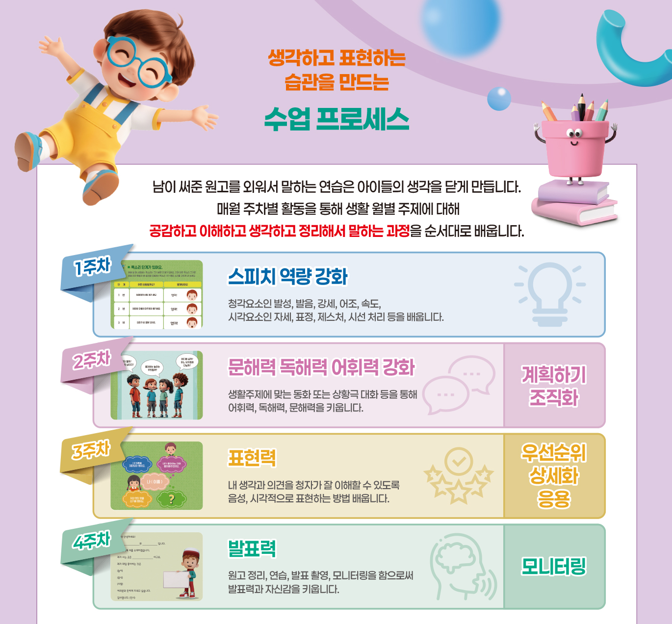 유아 · 초등 말하기 수업 전문 15년 ‘언어소통연구소’가 만듭니다. AI 시대를 살아갈 우리 아이들에게 진짜 필요한 소통 능력은 공감력, 창의력 그리고 생각의 힘 입니다.